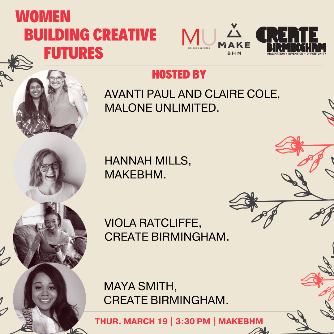 Join Create Birmingham, Malone Unlimited, and MAKEbhm for a special workshop and networking event geared towards Birmingham’s women-led creative community! Take part in a workshop led by Malone Unlimited, and learn how to fund your business for growth. Meet the Creative Entrepreneurship team at Create Birmingham and connect with our programs, and find out more about the incredible classes, and opportunities for office/ studio space available at MAKEbhm.